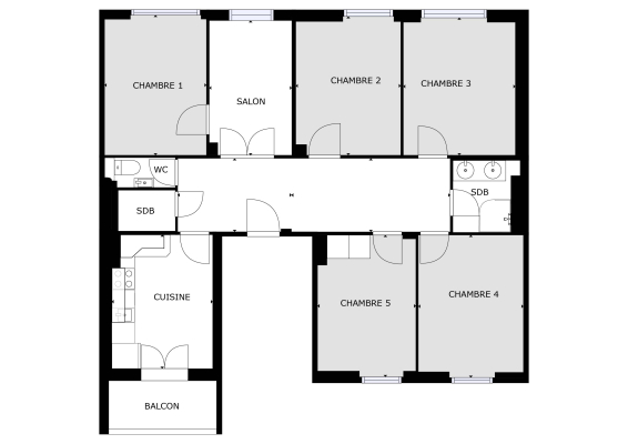 Cet appartement de 92 m2 se compose de : 5 chambres, d'un salon, d'une cuisine tout équipée donnant sur un balcon de 4m2, de 2 salles de bains et d'un WC indépendant.